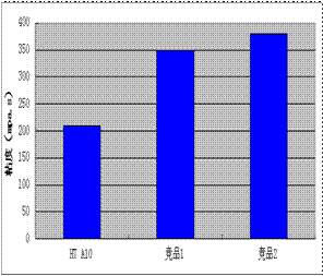 和競品1、競品2比較,分散劑HT A10制備的酞菁藍無樹脂水性色漿的粘度很低、遮蓋力很高。HT A10制備的酞菁藍水性色漿的粘度為210 mPa.s,競品1制備的色漿粘度為350 mPa.s,競品2制備的色漿粘度為380 mPa.s,相對于競品1和2,HT A10降粘效果分別提高了40%和45%。